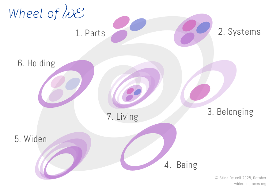 In the sixth step, we identified as one of our wider Embraces, and we lean inwards, holding all our parts unconditionally. I am them and they are me.